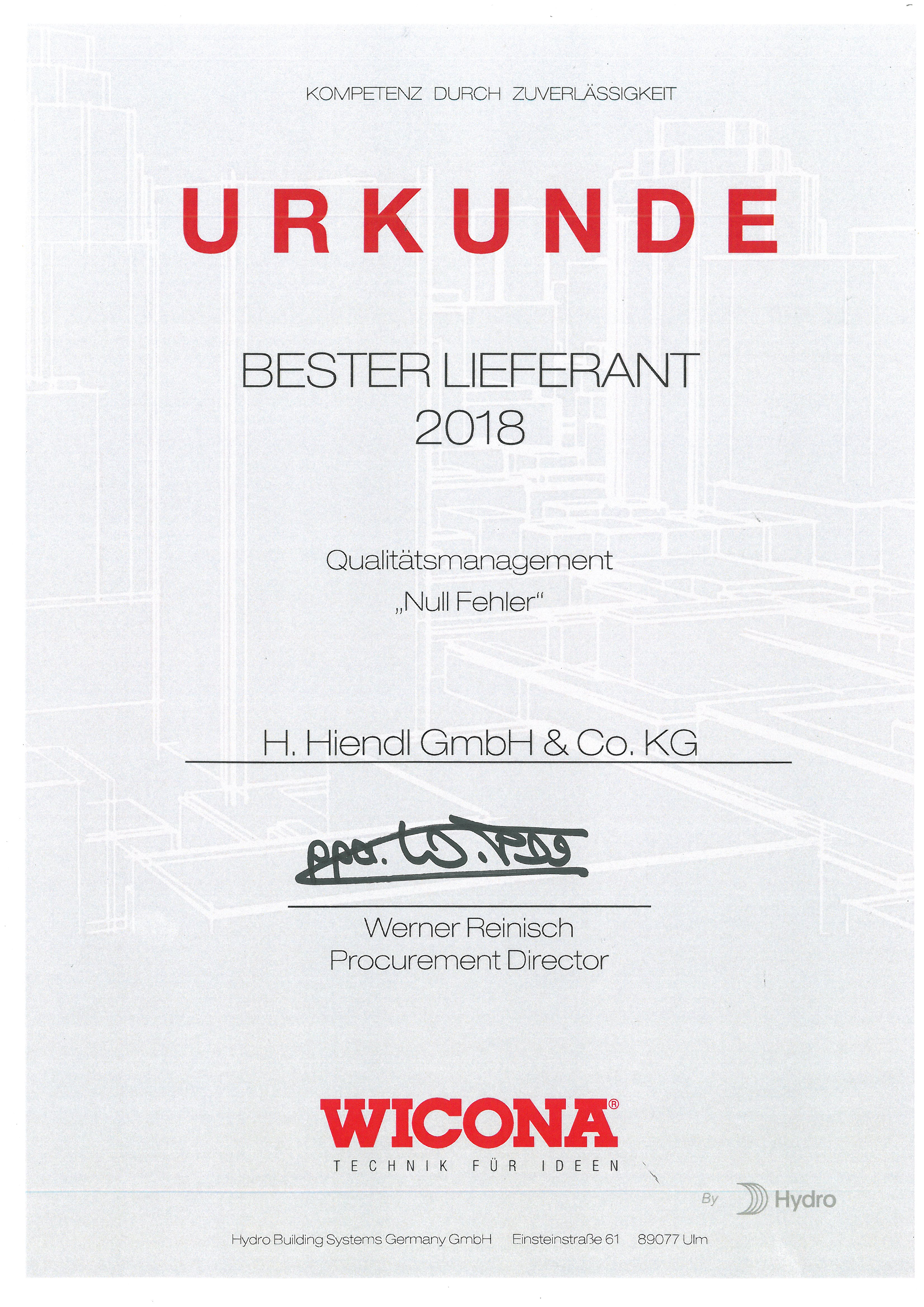 Im Rahmen des Lieferantentages der Firma WICONA in Frankfurt a. Main wurde die H. Hiendl GmbH & Co. KG als "Bester Lieferant 2018" ausgezeichnet. Vertriebsleiter Ulrich Kizak bekam die Urkunde von Werner Reinisch (Director Procurement) überreicht. Als Grund für die Auszeichnung nannte Reinisch die hervorragende Produktqualität und Liefertreue von Hiendl.